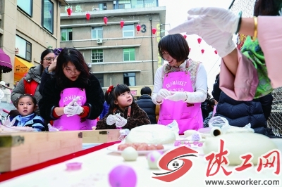 ②市民在西安市老菜场市井文化创意街区参与搓元宵活动,体验手工制作美食的乐趣。
