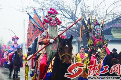 ④3月2日,陇县黄花峪村社火队在游演途中。陇县是“中国社火文化之乡”,当地耍社火的历史可追溯至两千多年前。马社火以演员骑于马上而得名,是陇州社火最具代表性的形式之一。
