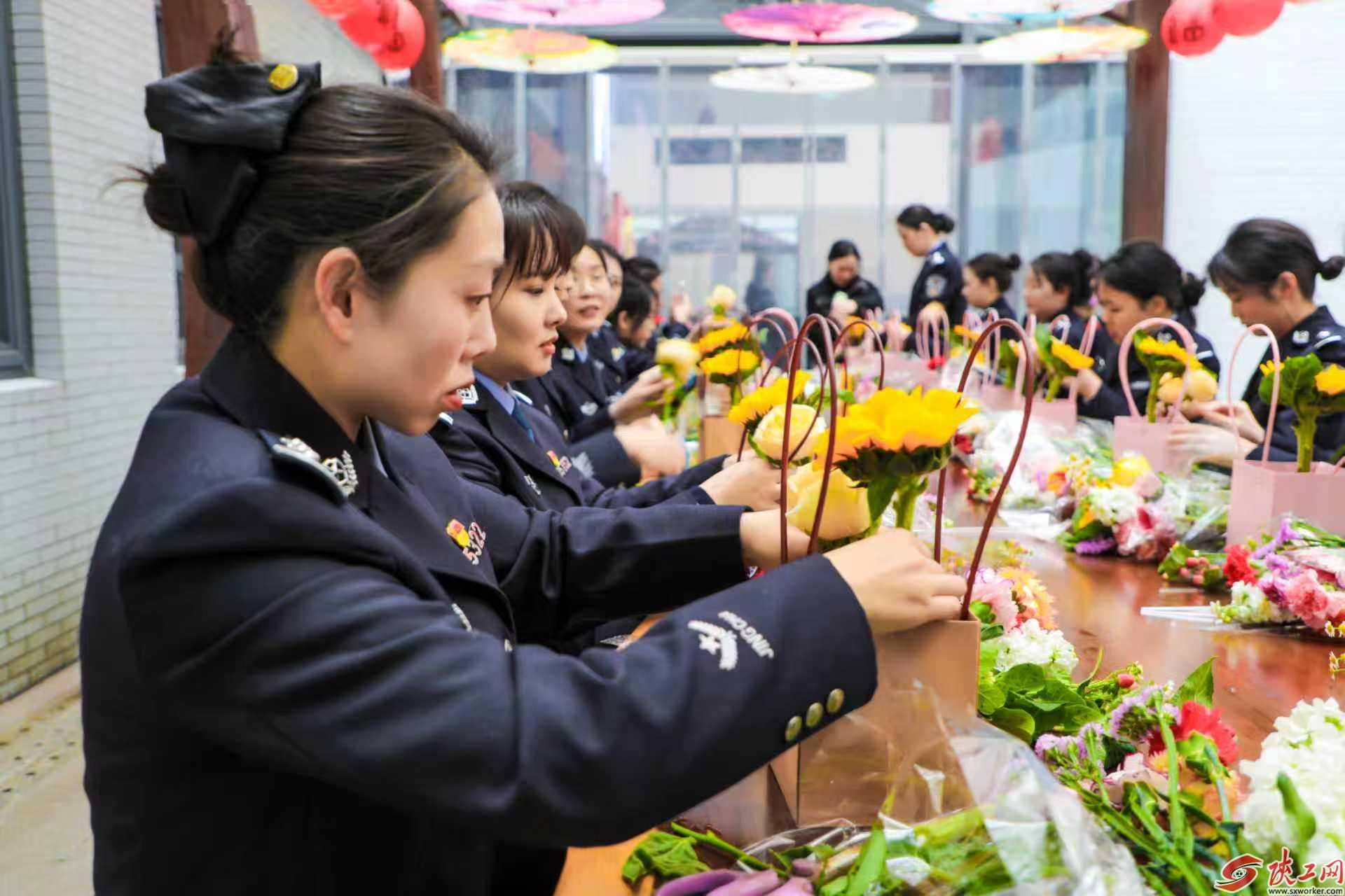 巧手传情,绽放巾帼之美。在安康市博物馆内,温馨的插花活动同步开展,为节日增添了别样浪漫与雅致。花艺老师现场授课,详细讲解花材搭配、修剪技巧和造型设计。平日里身着警服、坚守工作一线的女民警们,此刻化身心灵手巧的“花艺师”。她们认真挑选花材,精心修剪枝叶,巧妙搭配色彩,将向日葵的蓬勃、玫瑰的娇艳、康乃馨的温婉,打造成一束束独具匠心的花艺作品。现场花香四溢、笑语盈盈,大家在动手实践中放松身心、陶冶情操,在交流互动中增进情谊,充分展现了铁路公安女民警刚柔并济、温婉雅致的巾帼风采。