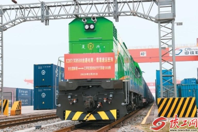 X387次“丝路电商”班列从西安国际港站缓缓驶出 通讯员 杨玥 摄 2月25日上午,满载着55个集装箱电商快递货物的X387次“丝路电商”班列从西安国际港站缓缓驶出,一路向西开往乌鲁木齐;