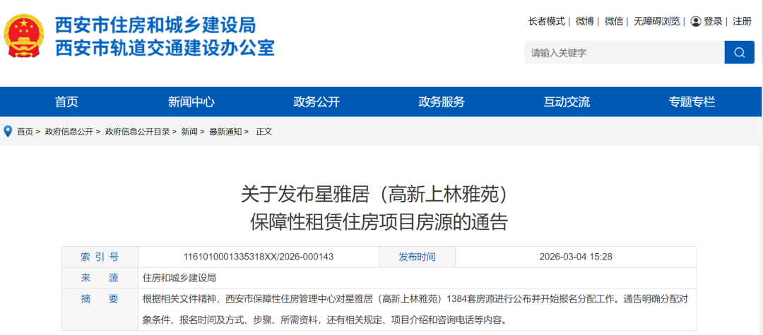 3月4日 西安市住房和城乡建设局网站发布 关于发布星雅居(高新上林雅苑)保障性租赁住房项目房源的通告 具体内容如下 ↓↓↓ 根据《西安市人民政府办公厅关于加快发展保障性租赁住房的