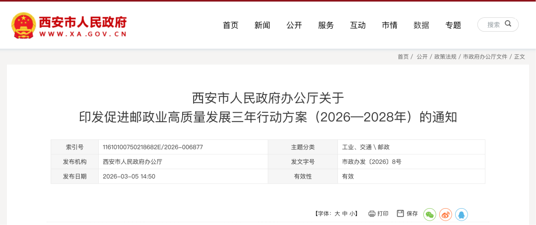 3月5日 西安市人民政府网站发布西安市人民政府办公厅关于印发促进邮政业高质量发展三年行动方案(2026—2028年)的通知 具体内容如下 ↓↓↓ 点击图片查看原文 各区、县人民政府