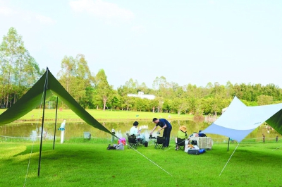 国庆中秋假期,广州的游客在天幕旁享受露营时光。
