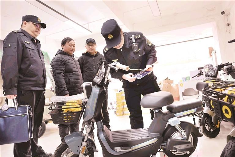 12月2日,市场监管部门对西安两家电动自行车大型销售市场进行执法检查,并向销售人员和消费者宣传新国标电动自行车的优点及相关政策。