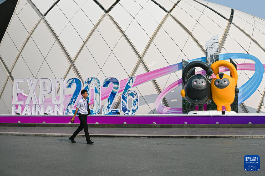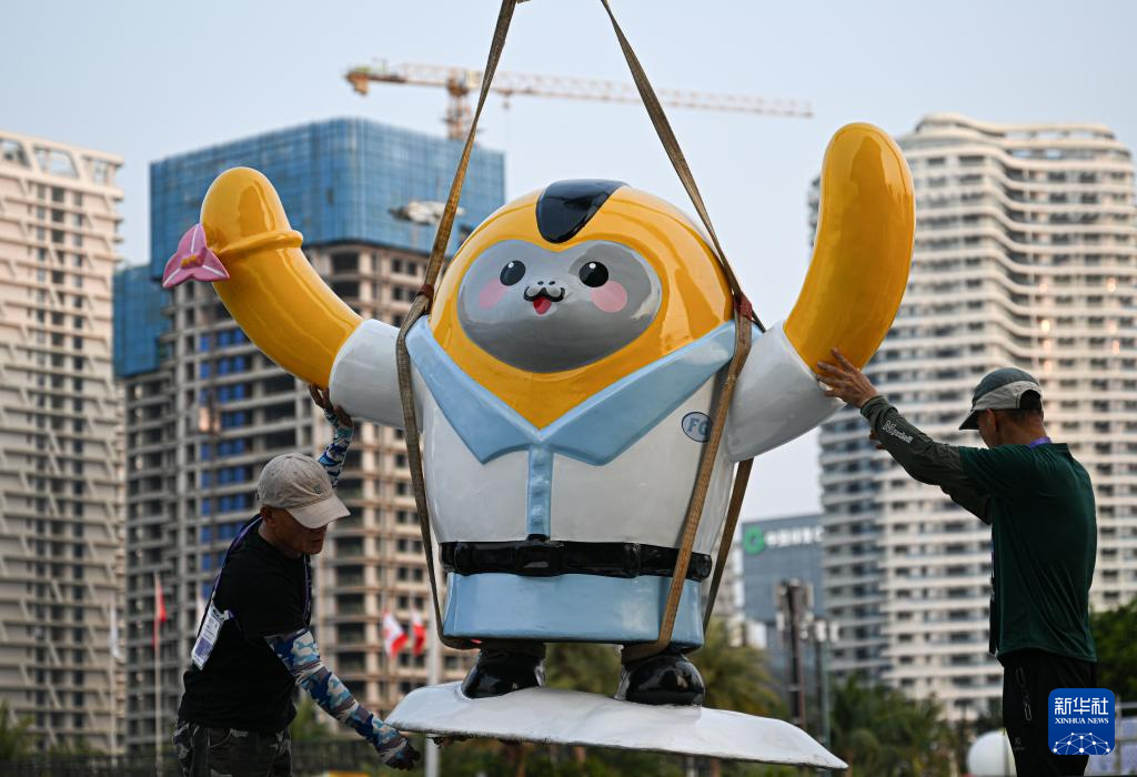 4月10日,工作人员在第六届消博会主会场外吊放消博会吉祥物。新华社记者 蒲晓旭 摄